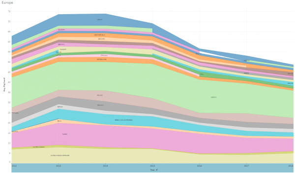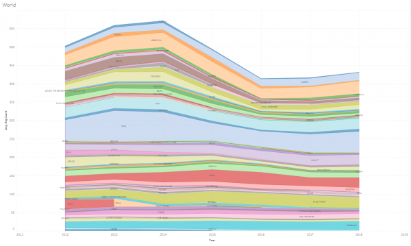 While North America activity dived at the end of 2014 and emerges from the recession and oil price slump in 2016, countries in Africa were relatively active during the oil slump and seem to feel the effect of the downturn only in 2016-2017. Drilling in the Middle-East went relatively steady throughout the downturn (it’s mostly the production that is manipulated by OPEC, not necessarily drilling). Mexico’s rig utilisation decreased steadily (maybe waiting for the effect of it’s business overhaul), while Argentina held course (mostly targeting long term unconventional gas).
